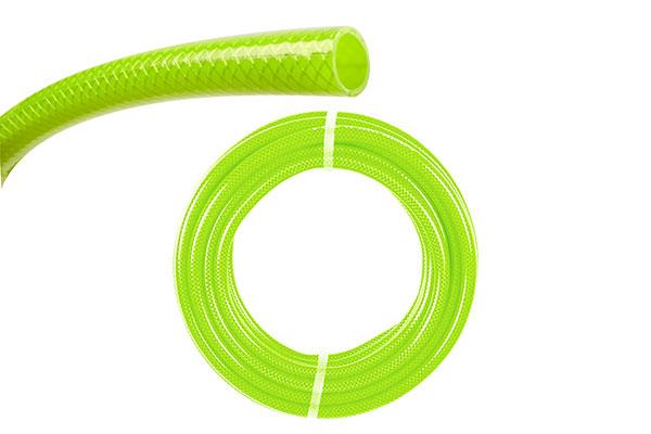 Manguera ligera de PVC alimentario (BPA free) anti-UVA con refuerzo trenzado de hilo de poliéster para mayor resistencia a la presión.